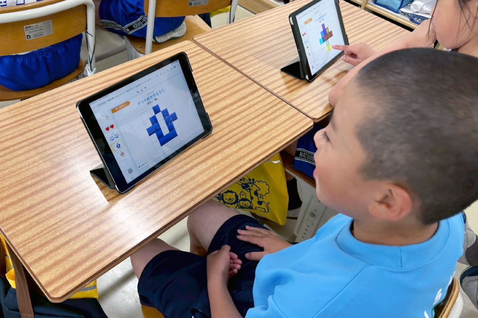 iPadを手に、子どもたちが互いにアイデアを見せ合う光景は、この小学校の日常となりました。