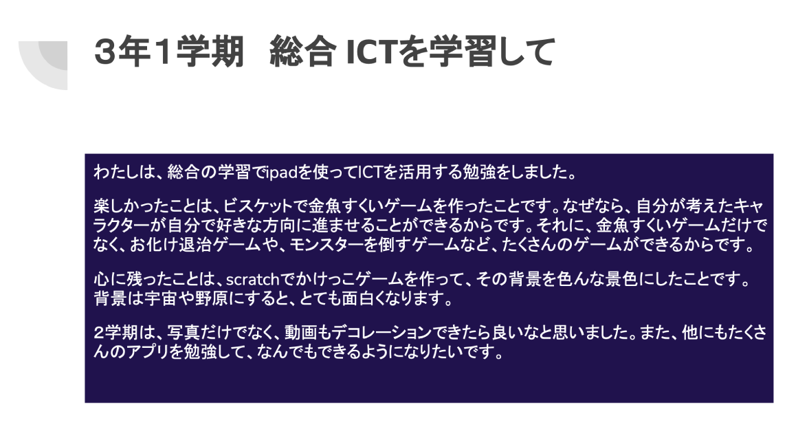 ICTを好きになった子どもたちは、自然とパソコンを他の教科や課題でも活用するようになります。今では、授業で学んだことをスライドにまとめたり、課題作りに挑戦することはもちろん、夏休みの自由研究では、初めてICTを使った作品を仕上げてくる児童も現れました。