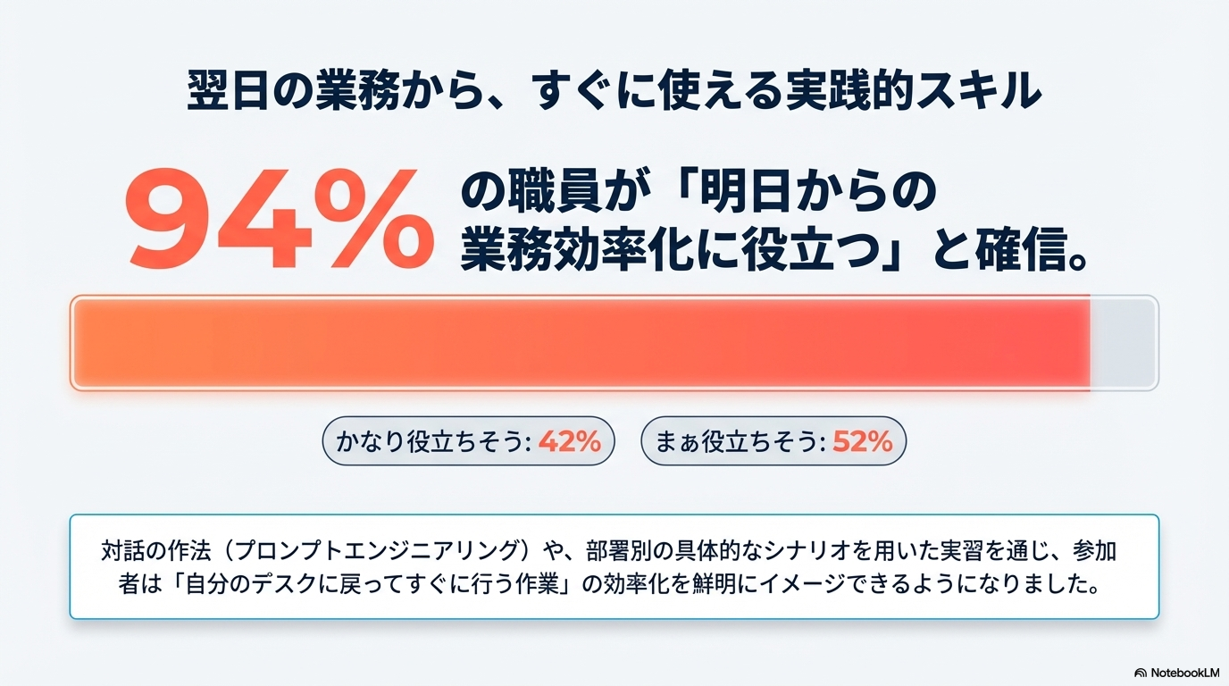 研修前は「AIを利用したことがない・ほとんど使っていない」という方が約4割を占めていましたが、100名が参加した研修後には、9割以上(94%)の職員が「業務効率化に役立つと思う」「以前より業務で使うイメージが湧いた」と回答されました。
